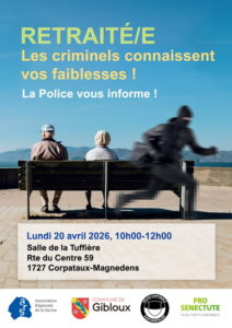 La sécurité de nos aînés.e.s est une priorité. Pour les aider à se défendre contre les arnaques en ligne, à domicile et par téléphone, l’ARS, la Police cantonale, la Commune de Gibloux et ProSenectute Fribourg invitent tous les seniors de la Sarine à participer à une séance de prévention qui aura lieu :